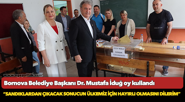 Oy kullandıktan sonra kısa bir açıklama yapan Bornova Belediye Başkanı Dr. Mustafa İduğ, “İkinci tur seçilerinde oyumuzu kullandık. İnşallah saat 17.00’den sonra oy kullandığım okula gelip sayım işleminin sonuna kadar sandığımızın başında olacağım. Seçimde oy kullanan herkese teşekkür ediyorum. Ülkemize hayırlı uğurlu olsun” dedi.