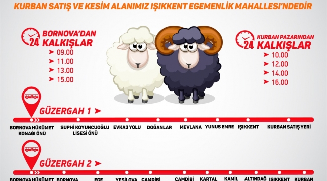 Bornova Belediyesi vatandaşların Kurban Satış ve Kesim Alanı'na rahatlıkla ulaşabilmeleri için ücretsiz servis hizmeti de sunuyor. Hükümet Konağı önünden ve Işıkkent'teki alandan karşılıklı olarak hareket edecek servisler Arefe Günü akşamına kadar iki ayrı güzergahtan hizmet verecek. Servisler Hükümet Konağı önünden 09.00, 11.00, 13.00, 15.00 saatlerinde hareket edecek. Servislerin Kurban Satış ve Kesim Alanı'ndan kalkış saatleri ise 10.00, 12.00, 14.00 ve 16.00. Servisler Bayramın 1. Günü de yine iki ayrı güzargahtan 09.00 ve 10.00 saatlerinde hizmet verecek.