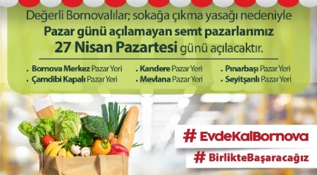 Bornova’da sokağa çıkma yasağı nedeniyle Pazar günü hizmet veremeyen tüm pazaryerleri Pazartesi günü açılacak. Bornova Belediyesi tarafından yapılan düzenlemeye göre; Bornova Merkez, Çamdibi, Mevlana, Pınarbaşı, Kandere ve Atatürk Mahallesi Şehit Kara Pilot Mehmet İlker Karaman Pazaryerleri Pazartesi günü kurulacak.