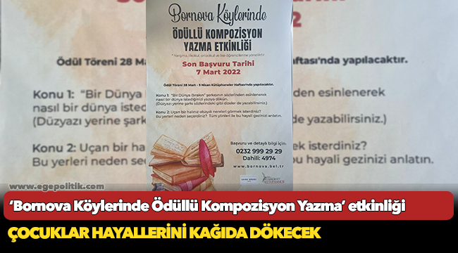 Yarışmada birinciye ışıklı dünya küre ve Kitap, ikinciye satranç takımı ve kitap, üçüncüye ise yapboz/boyama defteri ve kitap hediye edilecek. Kompozisyonların kargo yoluyla ya da muhtarlar aracılığı ile iletilebileceği etkinlik ile ilgili bilgi almak isteyenler www.bornova.bel.tr web sitesinden veya 0 232 999 19 19’dan dahili 4974’ü arayabilir.