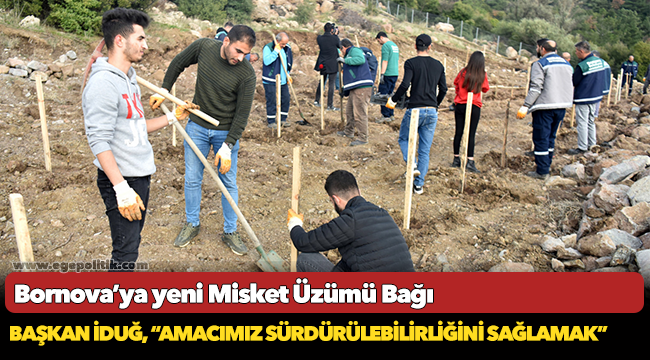 Bornova Belediye Başkanı Dr. Mustafa İduğ, yeni oluşturdukları bağdan 1 ton civarında üzüm hasadı yapmayı planladıklarını belirterek, “Amacımız Misket Üzümü’nün sürdürülebilirliğini sağlamak. İhtiyaç duyduğumuzda bu bağdan binlerce kalem temin edebileceğiz. Böylece Misket Üzümü asması üretip üreticilere ücretsiz dağıtarak Bornova Misket Üzümü’nün yeniden yaygınlaşmasını sağlamak istiyoruz” diye konuştu.