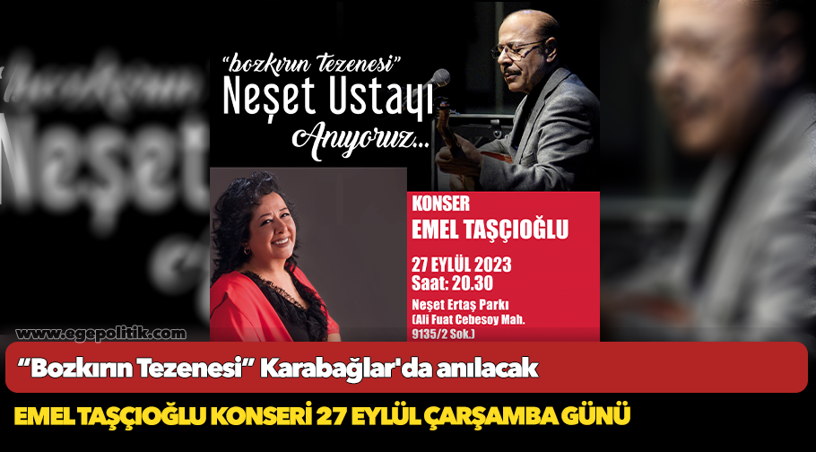 Halk Müziği'nin sevilen seslerinden Emel Taşçıoğlu, Ertaş'ın eserlerini Karabağlarlılar için söyleyecek. Konser 27 Eylül Çarşamba günü Ali Fuat Cebesoy Mahallesi'ndeki Neşet Ertaş Parkı'nda gerçekleştirilecek ve saat 20.30'da başlayacak.