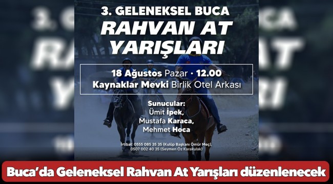 Buca Belediyesi ve Buca Rahvan Atlı Spor Kulübü iş birliğiyle 18 Ağustos Pazar günü saat 12.00’de Kaynaklar Sebze ve Meyve Hali yanında 3. Geleneksel Buca Rahvan At Yarışları düzenlenecek. Organizasyonda atlar, ikili tay, üçlü tay, dörtlü tay, taze beşli, deste, küçük orta, büyük orta, baş altı, baş atlar ve ithal A grubu olmak üzere toplam 10 kategoride yarışacak.