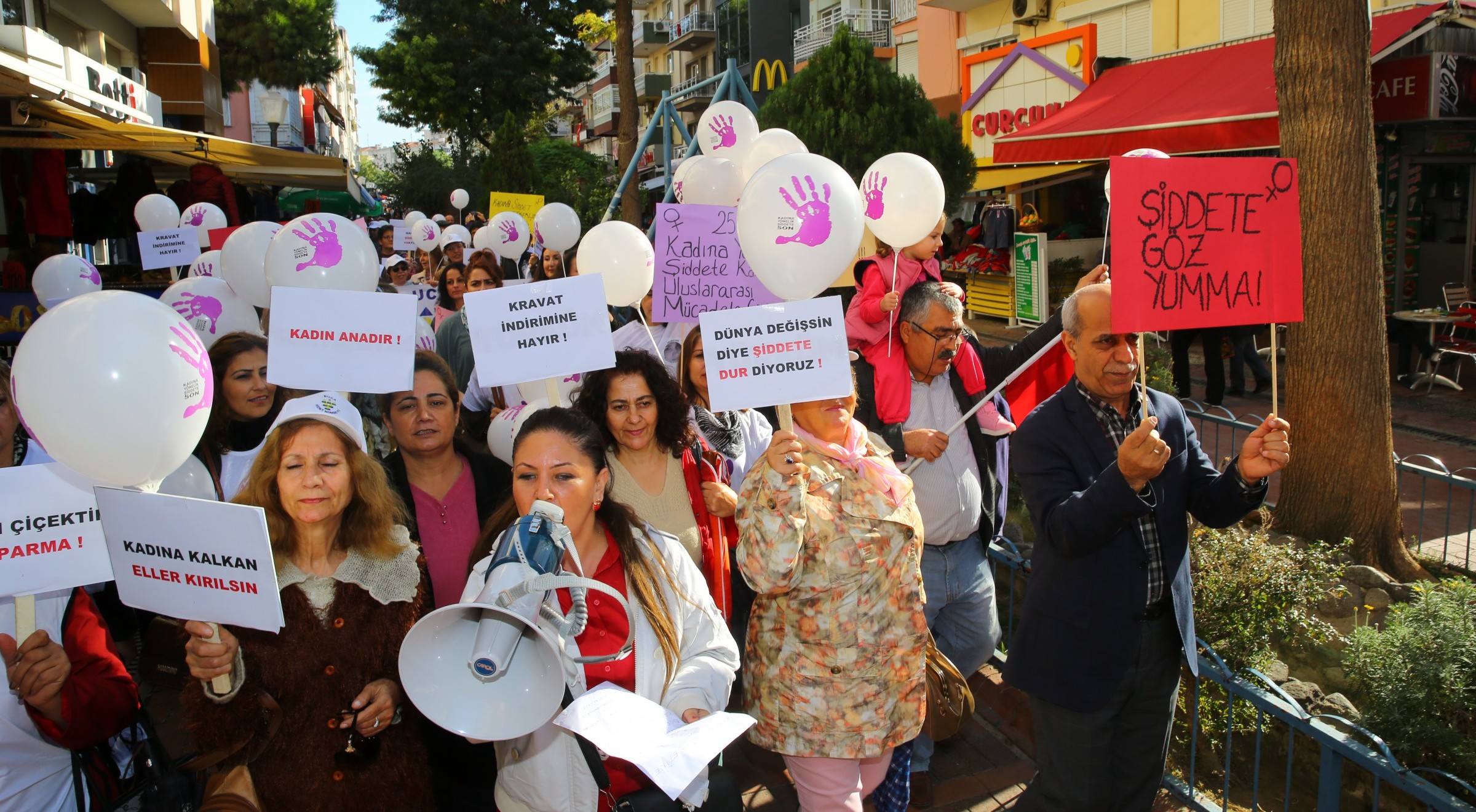 Bucalı kadınlar son yıllarda artan kadına şiddete “dur” demek için 25 Kasım Kadına Yönelik Şiddete Karşı Uluslararası Mücadele Günü’nde bir araya geldi. Buca Belediyesi Kadın ve Aile Hizmetleri Müdürlüğü organizasyonuyla Forbes caddesinde toplanan kadınlar isyanlarını anlatan sloganlar atarak kol kola yürüdü. Ellerinde ‘Sessiz kalma suça ortak olma’, ‘Kadın döven erkek değildir’ gibi yazıların yer aldığı dövizler taşıyan kadınlara erkeklerde destek verdi. Forbes Caddesi boyunca gerçekleşen yürüyüşte “Kadınlar özgür olsa dünya yerinden oynar’ , ‘Olmaz de! Dur de! Kadına şiddeti engelle!’ sloganları atıldı. Kadınların şiddete karşı isyanını dile getirdiği yürüyüşe Forbes esnafı da alkışlarıyla destek verdi.