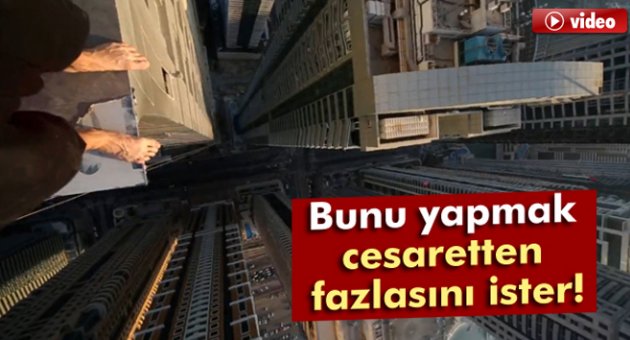 Birleşik Arap Emirliklerinin Dubai kentinde bir adrenalin tutkunu, kentin en yüksek binalarından birinin çatısına çıktı. Bu heyecan yetmemiş olacak ki şahıs, çatının hemen kenarında yürüyüş yaptı, hem de elindeki kamerayla. Yerden yüzlerce metre yüksekte yaşanan bu nefes kesen anlar, neyse ki bir facia yaşanmadan sona erdi.