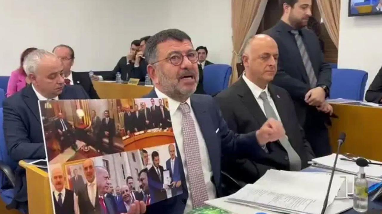 CHP Grup Sözcüsü ve Malatya Milletvekili Veli Ağbaba, toplantı başlamadan önce bazı iş insanları ve AKP’li isimlerin yer aldığı fotoğrafların bulunduğu bir döviz kaldırarak, CHP’nin cumhurbaşkanı adayı Ekrem İmamoğlu’na yönelik ‘casusluk’ soruşturmasına tepki gösterdi.