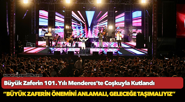 Büyük taarruz ile Cumhuriyete giden yolun açıldığını ifade eden Menderes Belediye Başkan V. Erkan Özkan, ‘’ Bugün, burada, yok edilmek istenen bir milletin canla, başla, inançla verdiği kurtuluş mücadelesinin fitilinin ateşlendiği kutlu zaferin 101. Yıl dönümünü büyük bir coşku ile kutluyoruz.