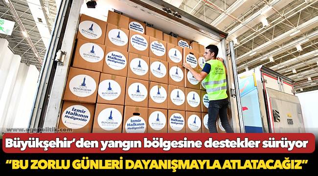 İzmir Büyükşehir Belediyesi yangınla mücadele eden Muğla’nın Bodrum ve Milas, Antalya’nın Manavgat, Aydın’ın Nazilli ilçelerine ve Denizli’ye destek vermeye devam ediyor. Portatif yataktan gıda paketine kadar pek çok ihtiyaç malzemesinin bulunduğu 15 araç, 38 personel yola çıktı. İzmir Büyükşehir Belediye Başkanı Tunç Soyer, “Dayanışmayla aşamayacağımız engel, çözemeyeceğimiz sorun yok. Bu zorlu günleri yine dayanışmayla atlatacağız, yaralarımızı birlikte saracağız” dedi.