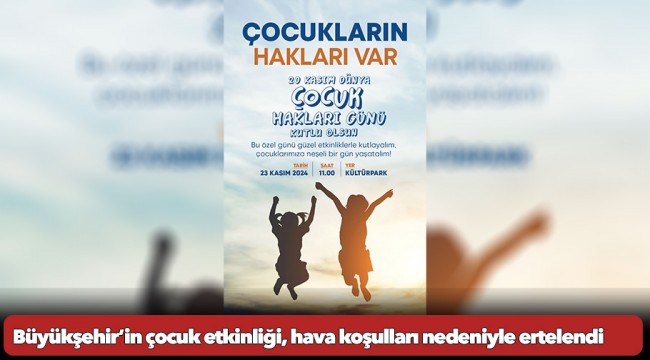 Çocuk haklarına dikkat çekmek amacıyla 23 Kasım Cumartesi günü Kültürpark Kaskatlı Havuz yanında İzmir Büyükşehir Belediyesi tarafından organize edilecek etkinlik ertelendi. 11.00-16.00 saatleri arasında yapılması planlanan etkinliğin, olumsuz hava koşulları nedeniyle ileri bir tarihe ertelendiği duyuruldu.