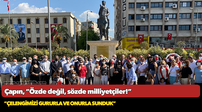 Polemik yaratmak dışında MHP’nin toplumda artık bir karşılığının kalmadığını söyleyerek sözlerine başlayan Çapın, “Bornova Belediye Başkanımız Sayın Mustafa İduğ’u ve şahsımı hedef alarak resmi törenlere katılmamakla suçlayan Sayın Turan Otlu, 29 Ağustos akşamı saat 21:00’e kadar resmi tören programının iktidarın mülki amirleri tarafından yapılmadığını biliyor mu? Sonra kafalarına esiyor iktidarın mülki amirleri resmi tören programı hazırlıyor. Cumhuriyeti kuran parti cumhuriyet düşmanlarının ve partimizi yok sayanların sözde törenine katılmaz. Bizlere, çelenk sunma hakkı bile vermedikleri bir düzmece törende Cumhuriyet Halk Partililerin yer alması Atasına ihanet olurdu. 30 Ağustos’un anlamını dahi bilmeyenler, arkaik bir kültürle sırf polemik yaratmak için konuşmasınlar. Biz Atamıza çelengimizi CHP, İYİ Parti ve ADD'nin birlikte düzenlediği törende gururla ve onurla sunduk. Bu toprakları yeniden vatan yaptığımız 30 Ağustos Zafer Bayramı coşkusunu ilelebet yaşatacağız. Bizlere bağımsız bir ülkenin yurttaşı olma gururunu veren, demokratik, laik ve özgür bir ülke bırakan Mustafa Kemal Atatürk ve mücadele arkadaşlarına minnettarız” dedi.