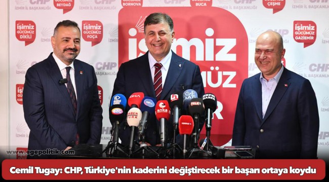 CHP İzmir Büyükşehir Belediye Başkan Adayı Dr. Cemil Tugay, seçim sonuçlarının yavaş yavaş netleşmesinin ardından CHP Koordinasyon Merkezi'nde basın mensuplarına açıklamalarda bulundu. CHP Genel Başkan Yardımcısı ve İzmir Milletvekili Murat Bakan, CHP İzmir İl Başkanı Şenol Aslanoğlu ile kameraların karşısına geçen Cemil Tugay, tarihi bir gün yaşandığını söyledi.