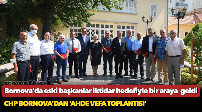 CHP’li siyasetçiler Bornova Belediyesi Dramalılar Köşkü Kent Arşivi ve Müzesi’nde düzenlenen ‘Ahde Vefa Toplantısı’nda bir araya geldi. Geçmiş dönemde yaptıkları çalışmalarla Bornova siyasi tarihinde iz bırakan CHP’lilere plaket takdim edilen toplantı CHP Bornova İlçe Örgütü tarafından düzenlendi. Açılış konuşmasını CHP Bornova İlçe Başkanı Av. Ertürk Çapın’ın yaptığı ve plaketleri Bornova Belediye Başkanı Dr. Mustafa İduğ’un takdim ettiği toplantıya Bornova eski Belediye Başkanları Aziz Kocaoğlu, Dr. Sırrı Aydoğan, Ali Sözer, Olgun Atila ve Prof. Dr. Kamil Okyay Sındır ile CHP eski Bornova İlçe Başkanları Enver Dündar, Fatma Doğru, Kerim Özer, Asım Güven, Necati Yıldız, Kenan Güler, Yavuz Nedim Yokaş, Lütfi Özer ve Mehmet Türkmenoğlu katıldı.