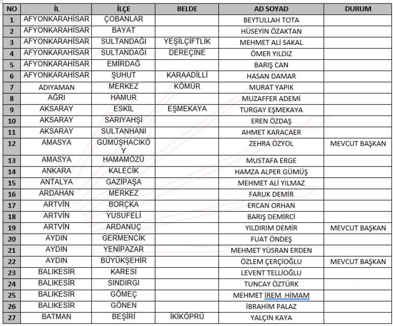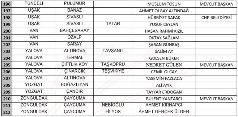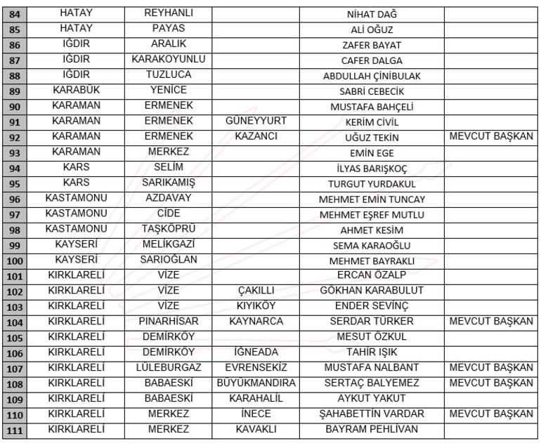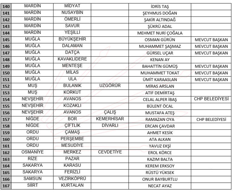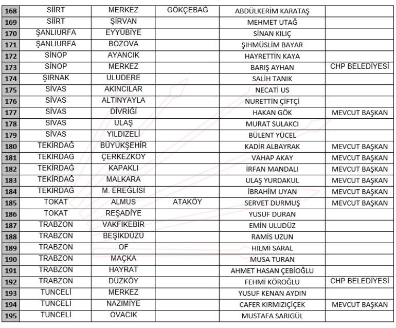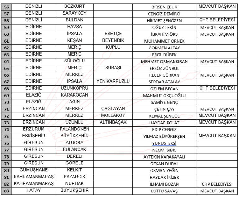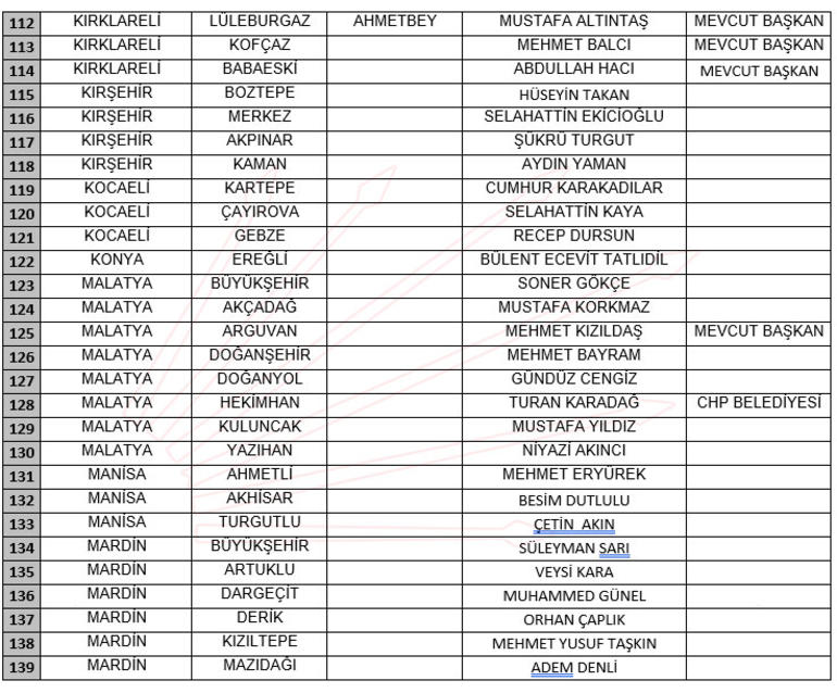 Öte yandan kulislere adaylıkları netleşen ilk isimler de yansımaya başladı. Cumhuriyet'in edindiği bilgilere göre; Edirne, Hatay, Sinop, Çanakkale, Eskişehir, Karaman, Kırşehir, Mardin, Muğla, Konya-Ereğli, Tunceli , Tekirdağ, Malatya, Aydın, Ardahan, Bilecik adayları belli oldu.
