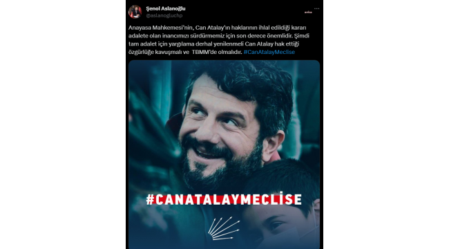 "Anayasa Mahkemesi’nin, Can Atalay’ın haklarının ihlal edildiği kararı adalete olan inancımızı sürdürmemiz için son derece önemlidir. Şimdi tam adalet için yargılama derhal yenilenmeli, Can Atalay hak ettiği özgürlüğe kavuşmalı ve TBMM’de olmalıdır. Can Atalay Meclis'e"