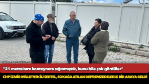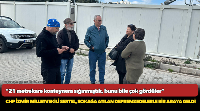 Cumhuriyet Halk Partisi (CHP) İzmir Milletvekili Atila Sertel, beraberinde CHP İzmir İl Başkan Yardımcısı Işık Doğusoy ile birlikte Bayraklı’daki konteyner kent alanına giderek barındıkları yerden çıkarılan depremzedelerle bir araya geldi. Sertel, “Bizim belediyelerimiz kimseyi mağdur etmez. Sakin olun. Kendinizi çaresiz hissetmeyin. Bizler gereğini yapacağız” dedi.