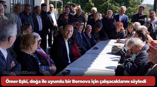 Bornova’nın tarihi dokusunun yanı sıra İzmir’in hem sanayi hem de kentsel genişleme açısından en önemli ilçelerinden olduğunu hatırlatan Ömer Eşki, “Mutlu insanların kenti Bornova, gelişmeye devam ederken doğayla uyumdan ve estetikten de ödün vermeyecek. Yeşil alanları arttırarak Bornova da hava kalitesini arttıracağız. Parklar içerisine kuracağımız havuz ve göletler ile yeni yapacağımız parklar ve arttıracağımız sokak ağaçları serinlik de sağlayacak. Belediyemize ait hizmet binalarından başlayarak üzerinde çim örtüsü olan yeşil çatılar tasarlayacak bu çatılar hem havanın temizlenmesine, hava kalitesinin artmasına hem de ısı yalıtımın güçlenmesine katkıda bulunur. Bornova‘da yemyeşil çatılar olduğunu hayal ediyoruz. Planları hazır, Bornovalıların gölgesinde huzur bulacağı, kuş seslerinin, Bornova papağanlarının günümüzü neşelendireceği Kent Ormanları kuracağız” diye konuştu.