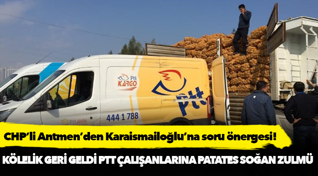 Konuyla ilgili Ulaştırma ve Altyapı Bakanı Adil Karaismailoğlu’nun yanıtlaması istemiyle önerge de veren CHP’li Antmen, Bakan Karaismailoğlu’na “PTT çalışanlarının sırtlarında patates soğan çuvalıyla kat kat çıkmak zorunda kalması kölelik değil midir? AKP ile birlikte yasaklanan kölelik geri mi gelmiştir? Bu yaşananlar vicdanınızı sızlatmıyor mu? PTT emekçilerinin sırtlarına patates soğan çuvalı yükleyeceğinize; halkı patates soğana muhtaç hale getirmeseydiniz daha iyi olmaz mıydı?” sorularını yöneltti.