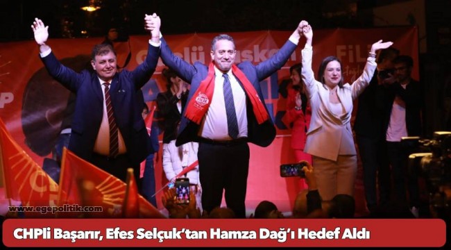 CHP Efes Selçuk Belediye Başkan adayı Filiz Ceritoğlu Sengel’in sahne arkasında duran afişini örnek göstererek konuşan Başarır; “Benim adaylarımın afişlerine bakıyorum. Bir cumhuriyet kadını var hemen yanında da altı ok var. Madem o partiden utanıyorsun neden aday oluyorsun. Hamza Dağ neden o ampul yok? İzmir’e gönderdikleri adaya bakın yıllarca milletvekilliği yapmış genel başkan yardımcılığı yapmış, İzmir’e gelen yatırımları, İzmir CHP’de diye engellemiş birisi. Daha geçen gün Menemen’de bir müftü çıkıyor Kubilay’ın katillerinin mezarına çocuklarımızı götürüyor. Hamza Dağ o müftünün yakasına yapışacaktın. Sen danışmanlarını FETO’nun arka bahçesi yapmış bir adamsın. Sana biz İzmir’i teslim etmeyiz. 31 Mart’ta daha saat 18:00 olmadan İzmir’in dağlarında çiçekler açacak” diye konuştu.