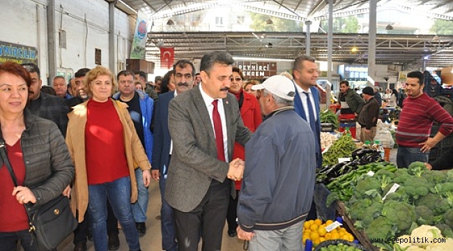 Pazar esnafıyla bir araya gelen Adil Kırgöz kendilerine hayırlı iş, bereketli kazanç dileklerini iletti. 31 Mart sonrası şeffaf ve hesap veren bir yönetim anlayışıyla esnafın yanında olacağını dile getiren Başkan Adayı Adil Kırgöz, "Yerli üretim ve milli servetimiz olan tarımımızı da tekrardan Dikili'de şaha kaldıracağız. Hem esnafımızı hem de yurttaşlarımızı yerli üretimle kalkındıracağız. Hizmet ederken kimseyi ayrıştırmayacağız. Herkese eşit davranacağınız. Esnafının sorunlarını dinleyen ve çözüm üreten olacağız. Dert olmaya değil, dertlere çare olmaya, derman olmaya geliyoruz. Aynı çatı altında birleştirici bir güç olarak, bir olacağız, biz olacağız" dedi.