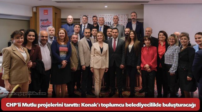 “Konak Mutlu Olacak” sloganıyla yola çıkan Cumhuriyet Halk Partisi (CHP) Konak Belediye Başkan Adayı Mimar Nilüfer Çınarlı Mutlu’nun Proje Tanıtım Toplantısı, Mövenpick Hotel İzmir’de yapıldı. Kampanya görselleri ve seçim şarkılarıyla renklenen toplantıya; CHP Parti Meclisi Üyesi Baran Bozoğlu, İl Başkanı Şenol Aslanolu, Konak İlçe Başkanı Ozan Ali İlgazi, meclis üyesi adayları ile il ve ilçe yöneticileri katıldı. Ulusal ve yerel basın temsilcilerinin yoğun katılımıyla gerçekleşen toplantıda konuşan Mutlu, göreve gelmesi durumunda hayata geçireceği projeleri 14 başlık altında açıkladı.