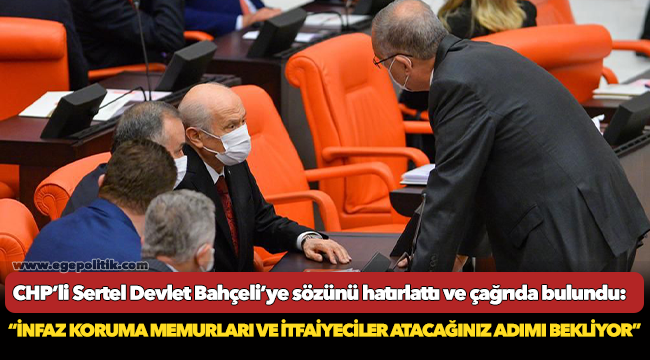 O dönem MHP lideri Bahçeli’nin talimatının ardından hem MHP Grup Başkanvekili Muhammed Levent Bülbül’ün hem de MHP Mersin Milletvekili Olcay Kılavuz’un infaz koruma memurlarıyla ilgili konuşma yaptıklarını ifade eden Sertel, “Bu konuşmalar ile umutlanmıştım. Sayın Bahçeli’nin sözünü tutacağını düşünmüştüm. Ama yanılmışım. Sayın Bahçeli’ye çağrıda bulunuyorum: İtfaiyecilik meslektir. Dünyanın her yerinde meslektir. Ancak Türkiye’de değildir. Genel İdari Hizmetler sınıfındadır. İtfaiyeciliği meslek yapalım. Kanun teklifini siz hazırlayın biz destek verelim. Ya da biz kanun teklifini tekrarlayalım siz destek verin. İnfaz koruma memurları da güvenlik sınıfına geçsin. Bu konuda sizin kararınızı beklediğimi ifade ediyorum” diye konuştu.