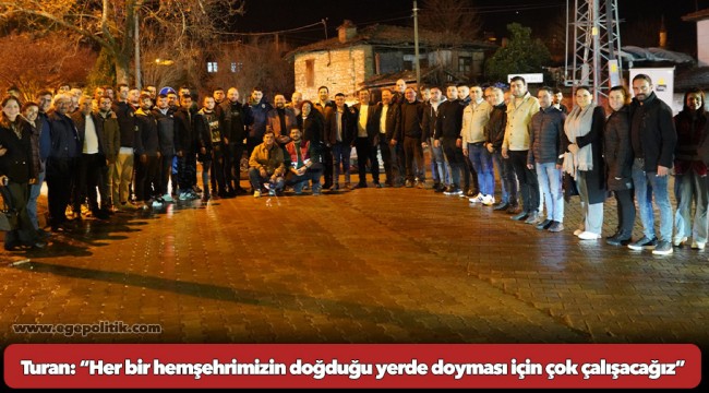 Ödemiş’in 99 mahallesinde yeni nesil belediyecilikle yeni bir sayfa açacaklarını belirten Turan, “Bozdağlar’dan Aydın Dağları’na dek hemşehrilerimize hedeflerimizi anlatıyor, talep ve önerilerini dinliyoruz. Her bir hemşehrimizin doğduğu yerde doyması, mutlu olması, üreticimizin üretimden kopmaması için için durmadan dinlenmeden çok çalışacağız. Merkezin ve kırsalın talepleri, beklentisi belli. Bu anlamda hem var olan iyi uygulamalarımızın daha da etkin şekilde sürmesi hem de yenilikçi bir bakış açısının sahada da hayat bulması bizim önceliğimiz olacak. Parklarıyla, meydanlarıyla, caddeleriyle pırıl pırıl bir Ödemiş’in yanı sıra hem üretime hem de gençlerimize yeni iş alanı olacak alanlara yönelik projelerimizi halkımızla paylaşacağız. Turizmin Ödemiş ekonomisindeki payını büyütmemiz gerekiyor. Ödemiş’te ürettiklerimizi katma değerli ürünler halinde buradan göndermemiz gerekiyor.