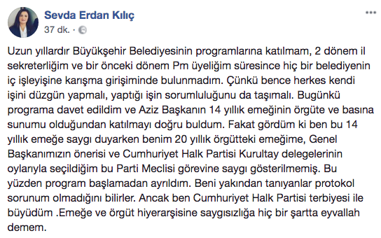 “Fakat gördüm ki ben bu 14 yıllık emeğe saygı duyarken, benim 20 yıllık örgütteki emeğime, Genel Başkanımızın önerisiyle Cumhuriyet Halk Partisi Kurultay delegelerinin oylarıyla seçildiğim Parti Meclisi görevine saygı gösterilmemiş. Bu yüzden program başlamadan ayrıldım” şeklinde dile getirdi.