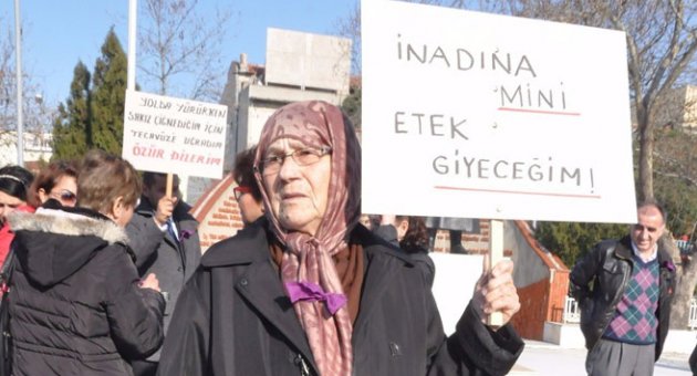 Öte yandan eylemde yaşlı bir kadının 'İnadına Mini Etek Giyeceğim' pankartı dikkat çekti.