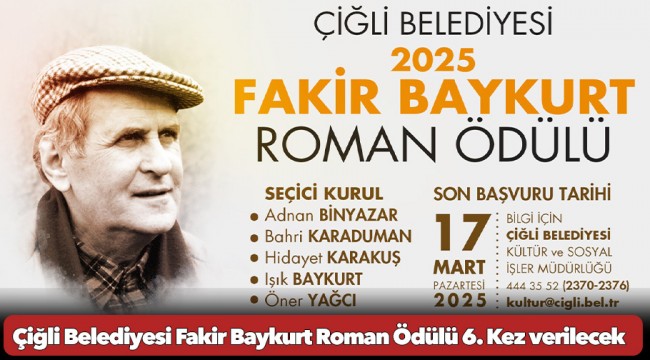 Başvurular 17 Mart 2025 Pazartesi gününe kadar kabul edilecek. Yarışmaya başvurmak isteyenler bilgi için Çiğli Belediyesi Kültür ve Sosyal İşler Müdürlüğü’ne 444 35 52 (Dahili: 2370-23-76) numaralı telefon ve [email protected] üzerinden iletişime geçebilirler. Öte yandan 2025 Fakir Baykurt Roman Ödülü Şartnamesi’ne https://www.cigli.bel.tr/doc/