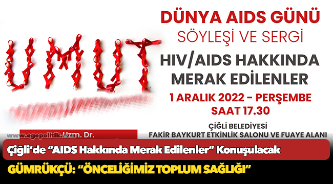 Kültür ve Sosyal İşler Müdürlüğü'nün organize edeceği HIV/AIDS Hakkında Merak Edilenler” seminer ve sergisi 1 Aralık Perşembe günü Çiğli Belediyesi Fakir Baykurt Salonu’nda gerçekleştirilecek. Enfeksiyon Hastalıkları Uzmanı Dr. Mürşide Tuncel Başoğlu’nun konuşmacı olarak katılacağı eğitim saat 17:30'da başlayacak ve halka açık olacak.