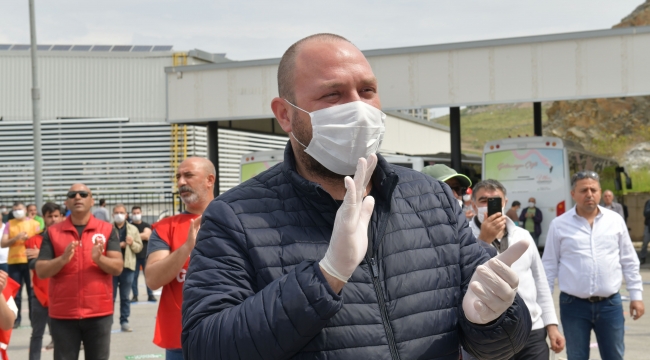 Geçmişten bugüne 1 Mayıs İşçi Bayramı kutlamalarının klasiği haline gelen halay seremonisi, Başkan Gümrükçü ve işçiler tarafından farklı bir yöntemle icra edildi. Koronavirüs ile mücadele kapsamında olası teması engellemek için Başkan Gümrükçü ve işçiler ellerindeki fırça saplarının birer uçlarını tutarak halay çektiler.