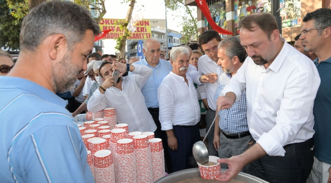 Muharrem Ayı’nın anlam ve önemine dair yapılan konuşmaların ardından Başkan Utku Gümrükçü, dev kazanların başına geçerek vatandaşa aşure dağıttı.