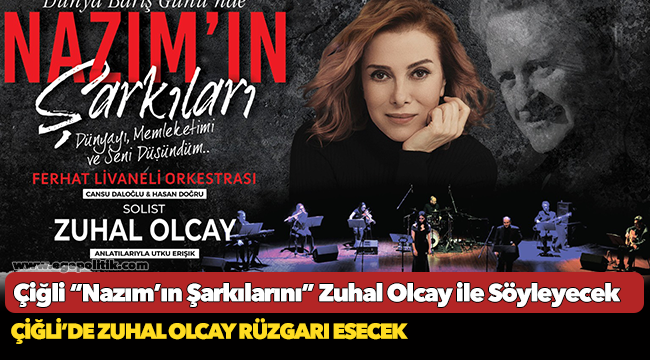 1 Eylül Perşembe günü Çiğli Belediyesi Cumhuriyet ve Demokrasi Parkı’nda gerçekleştirilecek ücretsiz konser saat 20:30’da başlayacak. İzmir'de ilk kez sahne alacak olan Zuhal Olcay, Türk Edebiyatı’nın duayen şairlerinden Nazım Hikmet’in birbirinden değerli eserlerini Ferhat Livaneli orkestrası eşliğinde seslendirecek. Yazar Utku Erişik anı ve şiirleriyle Çiğlili müzikseverlere unutamayacakları bir gece yaşatacak.