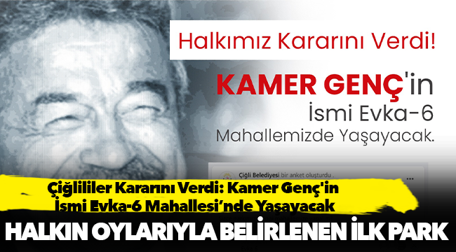 Başkan Gümrükçü’nün çağrısına en çok yorumun yapıldığı Ataşehir, Atatürk, Evka-5, Evka-6 ve Yakakent Mahalleleri arasında anket yapıldı. Çiğli Belediyesi’nin resmi sosyal medya hesapları üzerinden yapılan ankete katılanların büyük çoğunluğu, Kamer Genç’in isminin verileceği parkın Evka-6 Mahallesi’nde yapılması doğrultusunda oy kullandı. Göreve gelirken Çiğli’yi,Çiğlililer ile birlikte yöneteceğinin sözünü veren Başkan Gümrükçü, bu hareketiyle yapılacak parkın yerini vatandaşlara soran ilk Belediye Başkanı oldu.