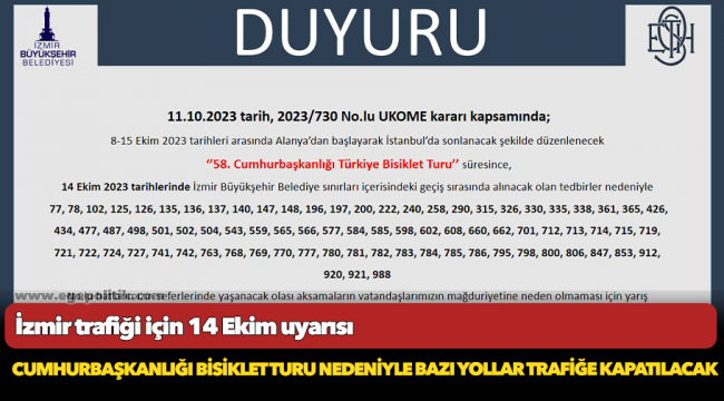 Bu yıl 58’incisi düzenlenen Cumhurbaşkanlığı Türkiye Bisiklet Turu’nun İzmir etabı, 14 Ekim 2023 tarihlerinde geçilmeye hazırlanılıyor. Saat 11.20’de Efes Antik Kenti’nden başlayacak, saat 15.20’de Karşıyaka Vapur İskelesi’nde son bulacak bisiklet turu için kent trafiğinde zorunlu değişiklikler yapılacak.