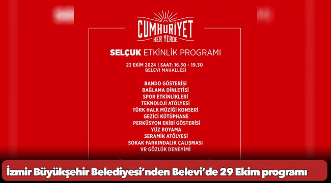 İzmir Büyükşehir Belediyesi tarafından gerçekleştirilecek olan etkinlik ile Cumhuriyet coşkusu Belevi’de yaşanacak.