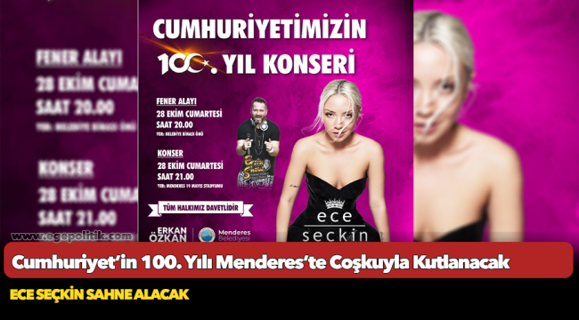 29 Ekim 100. Yıl Cumhuriyet Koşusunun ardından etkinlikler fener alayı ile devam edecek. Menderes Belediyesi önünden başlayıp Menderes 19 Mayıs Stadı’nda sona erecek fener alayının ardından statta Ersin şov gerçekleşecek. Ersin şovun ardından ise cumhuriyet coşkusu Ece Seçkin ile taçlanacak.