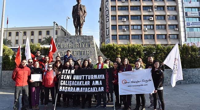 Törende konuşma yapan Bornova Belediye Başkanı Olgun Atila, Ata’ya Saygı Yürüyüşü’ne 3 senedir ev sahipliği yaptıklarını ifade ederek, “Ulu önderizmiz Mustafa Kemal Atatürk’ün ölümünün 79. yılında onun anısına düzenlediğimiz yürüyüşümüze katılan herkese teşekkür ederiz. Bu gün özgürce yaşayıp, konuşabiliyorsak bunu Atatürk ve Aziz şehitlerimize borçluyuz. Ve şunu unutmamalıyız. Atatürk bizim için özgürlüktür, barıştır ve umuttur. Asla onun yolundan vazgeçmeyeceğiz” dedi Türkiye Dağcılık Federasyonu İzmir İl Temsilcisi Siyami Çetin de Atatürk’ü özlemle andıklarını belirterek etkinlikte emeği geçenlere teşekkür etti.
