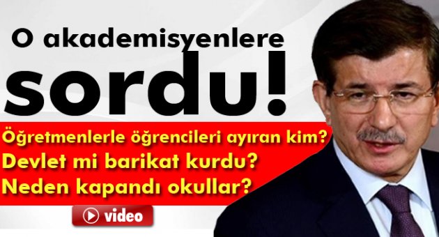 Başbakan Ahmet Davutoğlu, İstanbul’da Yükseköğretim Kurulu üyeleriyle bir araya geldi. Programda bir konuşma yapan Davutoğlu, Türkiye’nin gündemine oturan skandal bildiriye imza atan akademisyenlere yeni sorular yönelterek, “Bu aydınlara soruyorum, neden resmi tek taraflı çizersiniz, ya da bu metni bilimsel bir metin gibi altına imza atarsınız. Bu bilim adamlarına sormak isterim, 3 barikat, 5 çukur aşarak ve kaldırımlarda bombalara basmadan üniversitelere geçmeye çalışıyor olsalardı bu bildiriye imza atarlar mıydı? İmza atarak bunlara meşru muamelesi yapıyorlar. Öğretmenlerle öğrencileri ayıran kim, devlet mi? Devlet mi barikat kurdu? Neden kapandı okullar? Burada ahlaki sorumluluk gerekmez mi?” ifadelerini kullandı.