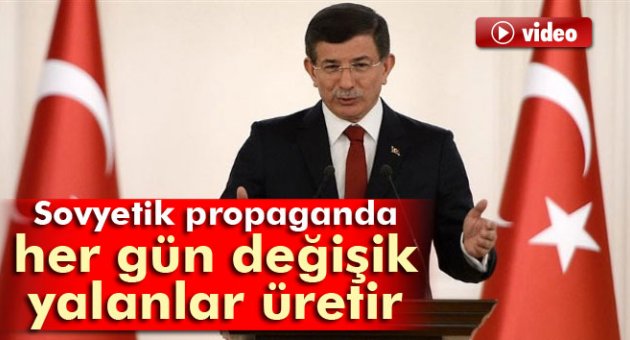 Rusya'nın Türkiye'nin IŞİD'den petrol aldığı yönündeki iddiasının hatırlatılması üzerine Davutoğlu, "Son bir hafta içinde Rus basını ve Rus yetkililerince yapılan açıklamalar bana gençliğimi hatırlatıyor. Soğuk savaş döneminde Sovyet propaganda makinesi vardı. Her gün değişik yalanlar üretir, önce kendileri inanır, sonra da dünyanın inanmasını beklerlerdi. Sadece Rusya'nın son 20-25 yıl içinde soğuk savaş sonrasında unuttuğunu sandığımız özellikleri, Sovyetik özellikleri doğrudan öne çıkıyor. Yayılmacı bir görüntü içinde komşu ülkelerle sorunlar yaşamak ve nihayet bütün bu sorunları örtmek için bir propaganda makinesini çalıştırmak. Bu, eskiden olan bir gelenekti ama bir anda kendini gösterdi. Bu Sovyetik propaganda makinesinin yalanlarına kimse itibar etmez. Ta ki çok açık bir dünyada yaşıyoruz, kimin ne yaptığı o kadar ayan beyan ortada ki" dedi.