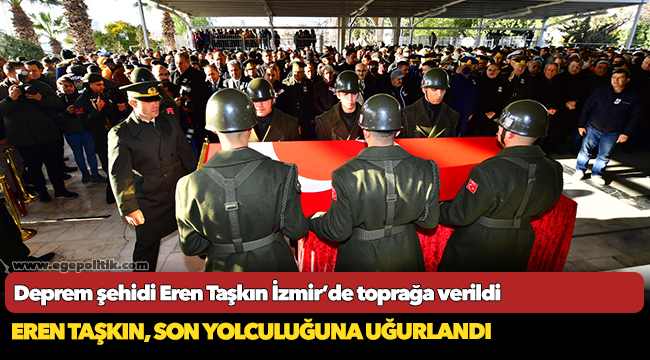 10 ili etkileyen deprem felaketinin Hatay’da askerlik yaparken yaşamdan ayırdığı İzmirli piyade er Eren Taşkın için Karşıyaka Beşikçioğlu Camii’nde tören düzenlendi. Törene şehidin annesi Dursune Taşkın ile kız kardeşi Ece Taşkın’ın yanı sıra İzmir Valisi Yavuz Selim Köşger, İzmir Büyükşehir Belediyesi Başkan Vekili Mustafa Özuslu, CHP İzmir Milletvekili Kamil Okyay Sındır, Ege Ordusu Komutanı Korgeneral Kemal Yeni, İzmir İl Emniyet Müdürü Mehmet Şahne, siyasi parti temsilcileri, yurttaşlar ve şehidin yakınları katıldı. Eren Taşkın’ın cenazesi Kadifekale Şehitliği’ne defnedildi.