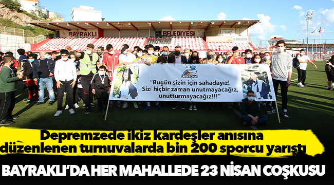 Spor İşleri Müdürlüğü tarafından hazırlanan futbol, basketbol, voleybol, jimnastik, ayak tenisi, engellilere yönelik corn hole ve masa tenisi turnuvaları ile Bayraklılı bin 200 çocuk Bayraklı Belediyesinin 23 Nisan Şenliklerinde bir araya geldi. Etkinliklerde pandemi tedbirleri kapsamında tüm önlemler alınırken, dezenfektan ve maske standıyla da çocuklar ve aileleri sürekli ellerini dezenfekte ederek, maskelerini yeniledi. Ayrıca tüm sporcular ve ailelerinin tesislere girişi, HES kodu sorgulamasının ardından güvenli şekilde sağlandı. Bu kapsamda Şehit Ümit Boz Spor Tesisi’nde düzenlenen turnuvaların finaline Bayraklı Belediye Başkanı Serdar Sandal, CHP Bayraklı İlçe Başkanı Pınar Susmuş, Sayra ve Çınar Alpgündüz’ün annesi Tülin Batmaz, babası Alican Alpgündüz, CHP Bayraklı kadın ve gençlik kolları, ilçe yöneticileri, meclis üyeleri, muhtarlar, amatör spor kulüpleri temsilcileri, sporcular ve aileleri katıldı.