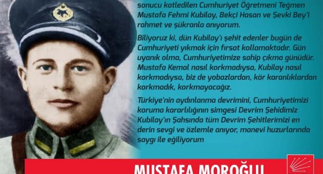 Türkiye'nin büyük aydınlanma devrimini, Cumhuriyetimizi koruma kararlılığının simgesi Devrim Şehidimiz Kubilay’ın Şahsında tüm Devrim Şehitlerimizi en derin sevgi ve özlemle anıyor, manevi huzurlarında saygı ile eğiliyorum