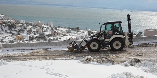 Dikili ilçesi genelinde özellikle de Çandarlı, Bademli ve Denizköy bölgelerinde etkili olan kar yağışına ve buzlanmaya karşı günün ilk saatlerinden itibaren teyakkuzda olan Dikili Belediyesi ekipleri, kentte ulaşımı sağlayan yolların kapanmaması, buzlanma ve don olayının yaşanmaması için yoğun çaba sarf etmeye devam ediyor.