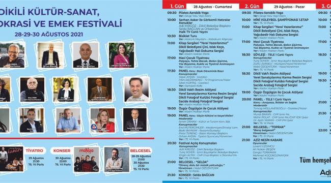 Festival boyunca pilates, aerobik ve yoga etkinliğinin yanı sıra Dikili Belediyesi Çini, Islak Keçe, Yağcıbedir Halı Dokuma sergisi de yer alacak. Çocuklar için palyaço, tahta bacak, balon şişirme, yüz boyama, kukla ve tiyatral animasyonun da olacağı festivalde Tiyatrocu Özgür Özgülgün tarafından çocuk atölyesi yapılacak. Yerel sanatçılar ile Sacide Arabağ’ın fotoğraf sergisi de festivalde yer alacak. Dikili, Kültür - Sanat, Demokrasi ve Emek Festivali’nin ilk gününde Halk TV’de yayınlanan Serhan Asker ile Görkemli Hatıralar canlı yayınına Dikili Belediye Başkanı Adil Kırgöz, Sanatçı Selda Bağcan ve Yazar-Yönetmen Nebil Özgentürk konuk olarak katılacak. Bisiklet turu ve kitap sergisinin de açılacağı festivalde Gazeteciler Yaşar Aydın, İrfan Değirmenci ve Sibel Hürtaş’ın konuşmacı olacağı “Baskı Döneminde Basın” konulu panel gündüz programında yapılırken, CHP Kültür, Sanat ve Turizm Başdanışmanı İsmet Orhan’ın moderatörlüğünde Akademisyen-Strateji Uzmanı Erol Mütercimler, Ressam-Siyasetçi Bedri Baykam, Basın Konseyi Başkanı Pınar Türenç ve Tiyatro Oyuncusu Orhan Aydın’ın konuşmacı olacağı “Göçün Kültürel ve Sosyal Etkileri” konulu panel akşam bölümünde gerçekleşecek. Festivalin açılış konuşmalarını ise Dikili Belediye Başkanı Adil Kırgöz, İzmir Büyükşehir Belediye Başkanı Tunç Soyer, CHP Grup Başkan Vekili-İstanbul Milletvekili Engin Altay yapacak. Dikili, Kültür - Sanat, Demokrasi ve Emek Festivali’nin ilk günü yönetmenliğini Nebil Özgentürk’ün yaptığı “Selda” belgeselinin ardından gerçekleşecek Selda Bağcan konseri ile sona erecek. Festivalin ikinci günü Mini Voleybol Şampiyonası’nın birinci etabı gerçekleşecek. TELE1’in canlı yayın yapacağı söyleşide ise İzmir Büyükşehir Belediye Başkanı Tunç Soyer, Müzisyen-Yazar-Yönetmen Zülfü Livaneli, Yazar-Yönetmen Nebil Özgentürk yer alacak. Moderatörlüğünü Gazeteci-Yazar Tuncay Mollaveisoğlu’nun yapacağı “Anayasa, İktidar ve Sağlık” konulu panelin konuşmacıları ise CHP İzmir Milletvekili Murat Bakan, CHP İzmir Milletvekili-YDK Üyesi Mahir Polat ve CHP PM Üyesi Dr. Aylin Yaman olacak. Belgesel kuşağında da yönetmenliğini Nebil Özgentürk’ün yaptığı “Toprak” belgeseli yayınlanacak. Festivalin ikinci gününde son etkinlik Levent Üzümcü, Ali Hakan Beşen, Cengiz Toraman ve Mehmet Küçükgünaydın sahne aldığı “Aziz Nesin Kabare” oyunu olacak. Dikili, Kültür - Sanat, Demokrasi ve Emek Festivali’nin son günü Mini Voleybol Şampiyonasıyla başlayacak. “Türkiye’nin Kayıp Yılları” konulu panelde CHP Ankara Milletvekili-PM Üyesi Gamze Taşcıer, Gazeteci-TV Programcısı Özlem Gürses ve Yazar Murat Ağırel yer alacak. 30 Ağustos Zafer Korteji ve Fener Alayı’nın da gerçekleşeceği festivalde Nebil Özgentürk yönetmenliğinde “Kurtuluştan Kuruluşa 30 Ağustos” belgeseli yayınlanacak. Festival Manga konseriyle son bulacak.