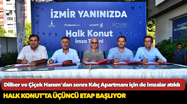 İzmir Büyükşehir Belediye Başkanı Tunç Soyer’in kooperatifçilik modelini depremzedeler için de uygulamaya koyduğu Halk Konut projesinde üçüncü etap için imza töreni düzenlendi. 30 Ekim İzmir depreminde evleri hasar gören yurttaşlar için geliştirilen Halk Konut projesi kapsamında Dilber ve Çiçek Hanım Apartmanı’nın ardından Kılıç Apartmanı sakinleri için de işbirliği protokolü imzalandı.