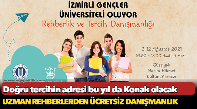Konak Belediyesi her yıl olduğu gibi bu yıl da üniversite tercihlerini yapacak gençleri yalnız bırakmadı. Yükseköğretim Kurumları Sınavı (YKS) sonuçlarının açıklanmasıyla birlikte tercih heyecanı yaşayan gençlere yol gösteren ve “İzmirli Gençler Üniversiteli Oluyor” mottosu ile gelenekselleşen rehberlik ve tercih danışmanlığı günleri için geri sayım başladı. 02-12 Ağustos tarihleri arasında Güzelyalı Nazım Hikmet Kültür Merkezi’nde gerçekleşecek rehberlik ve tercih danışmanlığı günleri ile üniversiteli adayı gençler tercih uzmanı eğitmenlerin rehberliğinde ücretsiz danışmanlık hizmeti alabilecek.