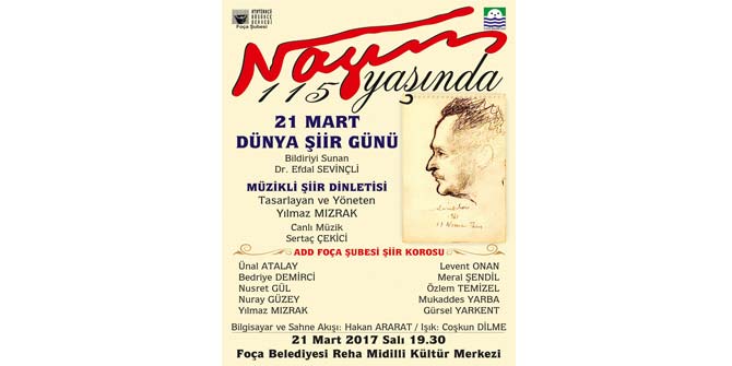 Foça Belediyesi Reha Midilli Kültür Merkezi’nde gerçekleşecek olan etkinlikte, Dr. Efdal Sevinçli ‘21 Mart Dünya Şiir Günü’ bildirisini sunacaktır. Emekli Edebiyat Öğretmeni Yılmaz Mızrak’ın tasarlayıp yönettiği ‘Nazım Hikmet 115 Yaşında’ adlı müzikli şiir dinletisini, ADD Foça Şubesi Şiir Korosu sesi ve müziği ile Sertaç Çekici seslendirecektir. 21 Mart 2017 Salı günü, saat 19.30’da başlayacak olan etkinliğe tüm halkımız davetlidir.