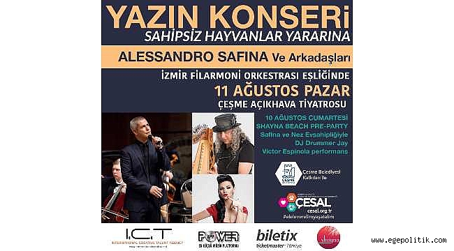 Çeşme Belediyesi’nin katkılarıyla Çeşme Alaçatı Doğa ve Hayvanseverler Derneği(ÇESAL) tarafından sahipsiz hayvanlar yararına gerçekleştirilen konserde Alessandro Safina ve Arkadaşları, İzmir Filarmoni Orkestrası eşliğinde sahne alacak. Çeşme Açıkhava Tiyatrosu’nda 11 Ağustos Pazar saat 21.00’de yapılacak konser gelirinin tamamı Çeşme’deki sahipsiz hayvanlara aktarılacak.