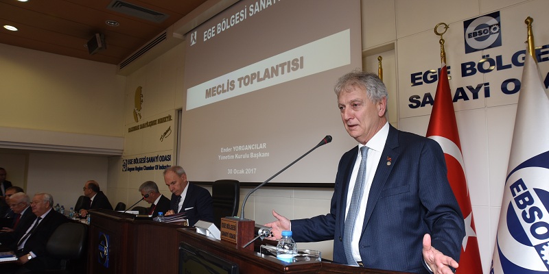 EBSO Başkanı Ender Yorgancılar, Türkiye ekonomisindeki gelişmelerden bahsederek başladığı açılış konuşmasında, ilk olarak uluslararası derecelendirme kuruluşları Fitch Ratings ve Standard & Poor’s’un Türkiye’nin kredi notunu düşürmesini değerlendirdi. Son olarak Fitch'in kararı sonrası, Türkiye'nin kredi notunun üç kredi derecelendirme kuruluşu tarafından da yatırım yapılamaz seviyeye düşürüldüğüne dikkat çeken Yorgancılar, “Bu kararın arkasında siyaset, güvenlik konusundaki çekişmelerle ekonomik bağımsızlık tezi öne çıkıyor. Bu, Türkiye'nin risk primini artırıyor, yabancı sermayenin ülkeye girişinde soru işaretleri oluyor. Daha önce olduğu gibi yatırım yapılabilir, önü açık güvenli ve istikrarlı Türkiye'yi desteklemek ve bunu sağlamak hepimizin görevi. Bu sadece cumhurbaşkanı ve hükümetin görevi değil. Toplumun tüm kesimlerinin bu işin içinde desteğinin olması gerekiyor. Çünkü başka Türkiye yok, hepimiz bu geminin içindeysek hep birlikte bu desteği vermek zorundayız” diye konuştu.